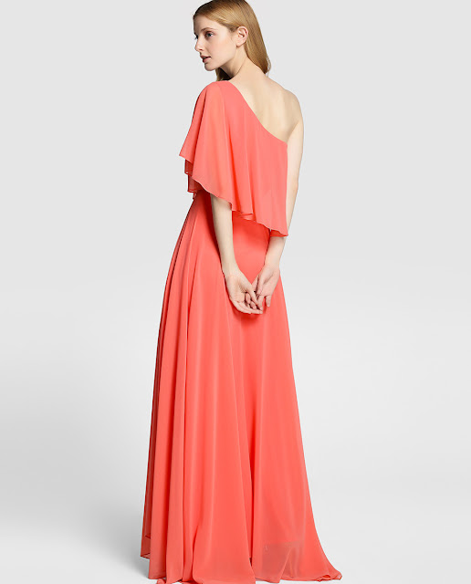 De este vestido, me quedo con la gran caída y por supuesto con su elemento estrella, el escote asimétrico. Es verdad que el color coral es tendencia pero si ya estás algo cansada de este tono, también puedes encontrar el vestido en color agua marina.