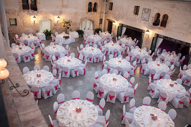 El banquete se realizó en el patio interior. Una de las cosas que más me llamó la atención al conocer Mas de Alzedo fue este patio, porque está cubierto por una lona gigante, lo cual permite realizar comidas o cenas en el caso de que llueva o haga mal tiempo.
