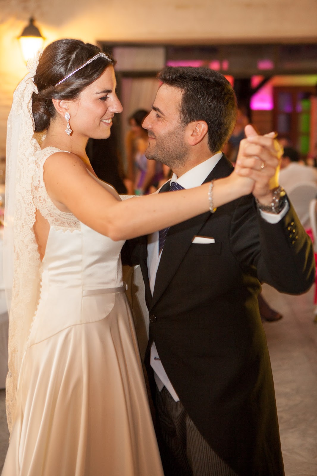 María llevó un precioso ramo de rosas rosas, unos increíbles pendientes colgantes y un tocado joya de la diseñadora Anina. El precioso velo de encaje partía de un moño bajo muy sencillo.