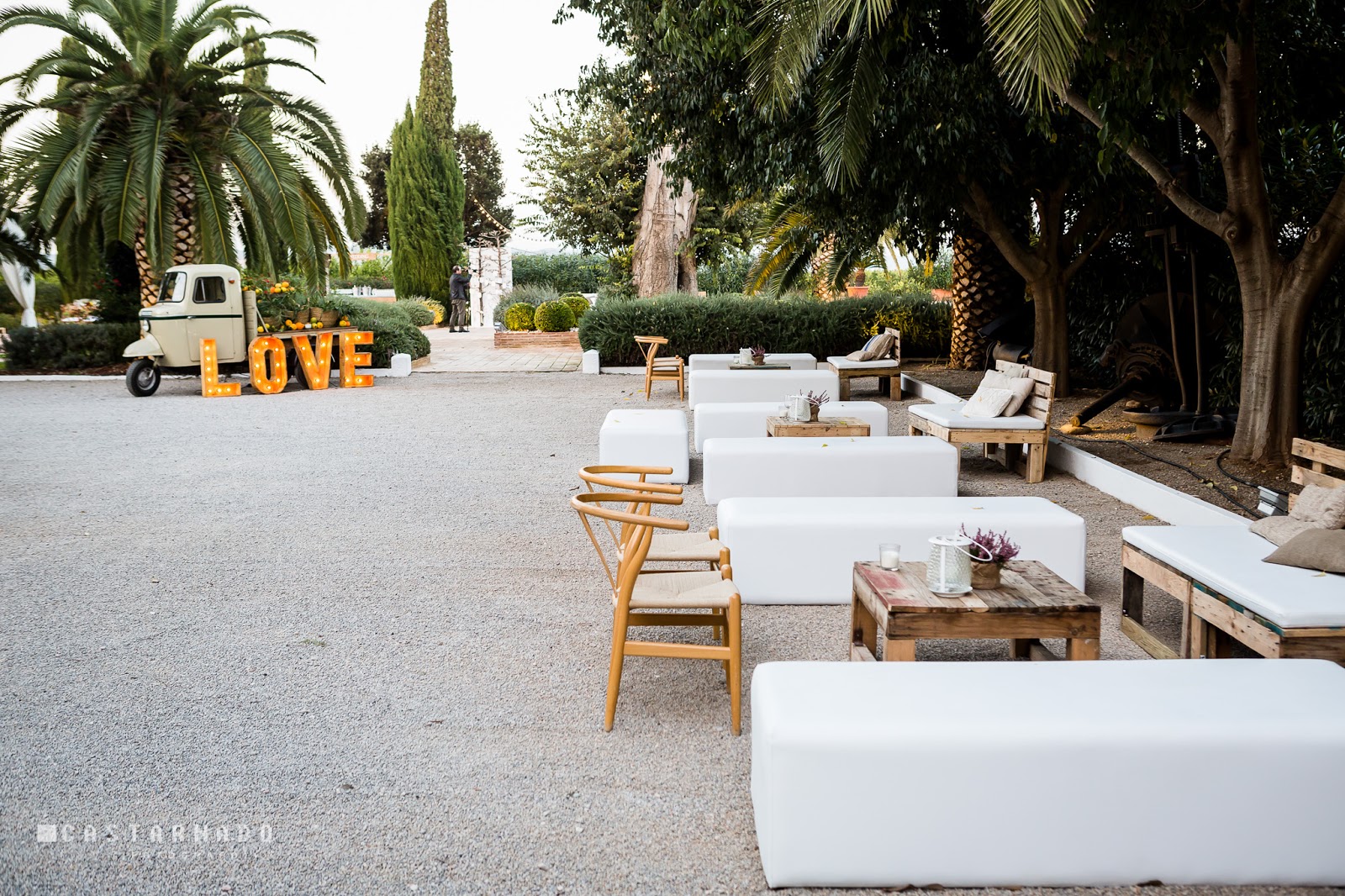 Volviendo a la Masía, lo primero que nos encontramos al cruzar la puerta principal es este maravilloso patio interior, un lugar perfecto para realizar el cóctel o para incluir zonas de chill out o photocall.