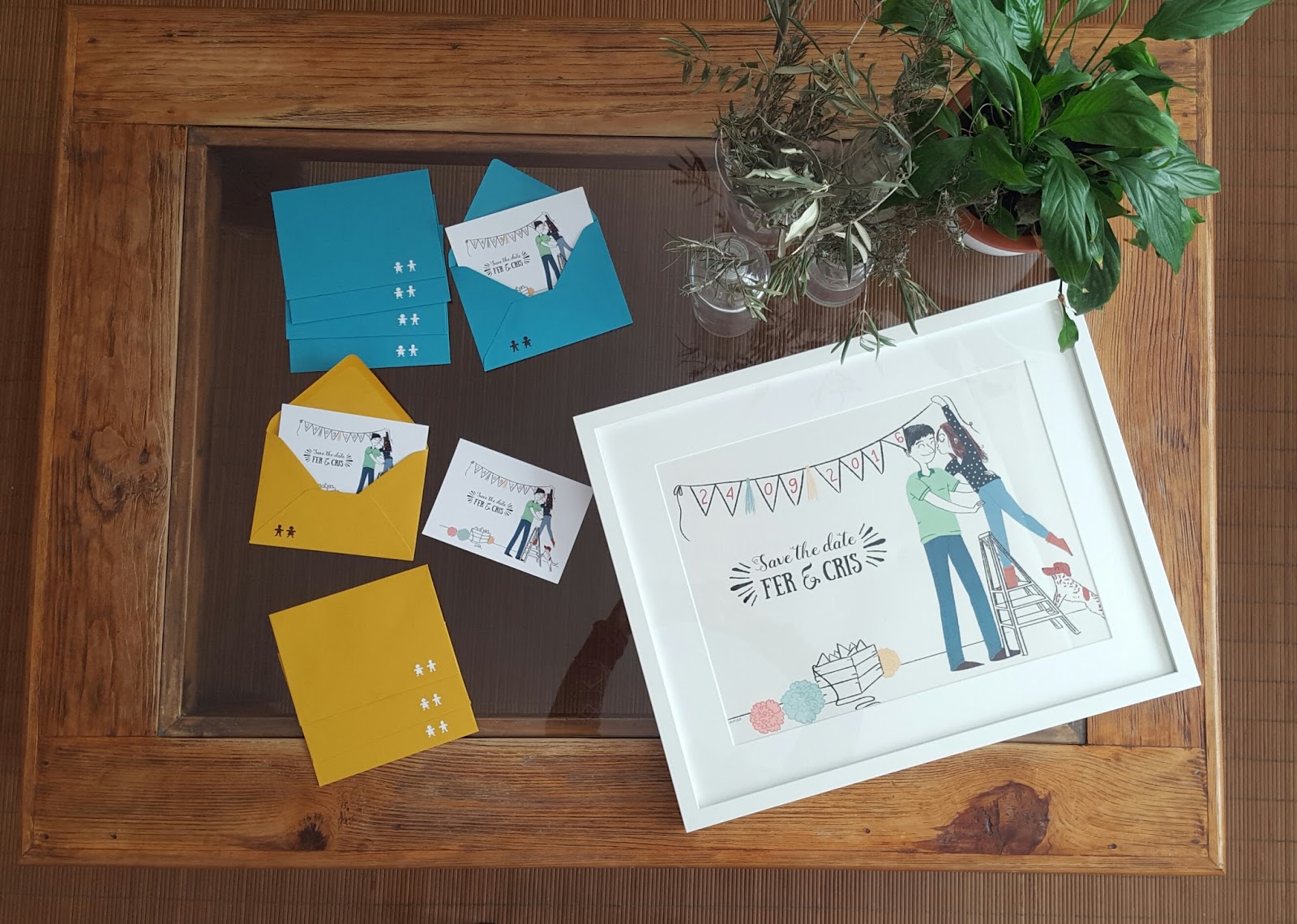Para compartirlo con los invitados, imprimimos una versión del SavetheDate en tamaño A6 y elegimos sobres en color turquesa y mostaza. Yo misma me encargué de troquelar dos muñequitos en cada sobre, una niña y un niño. Creo que le ha dado un toque informal pero sencillo, sin ser ambicioso.