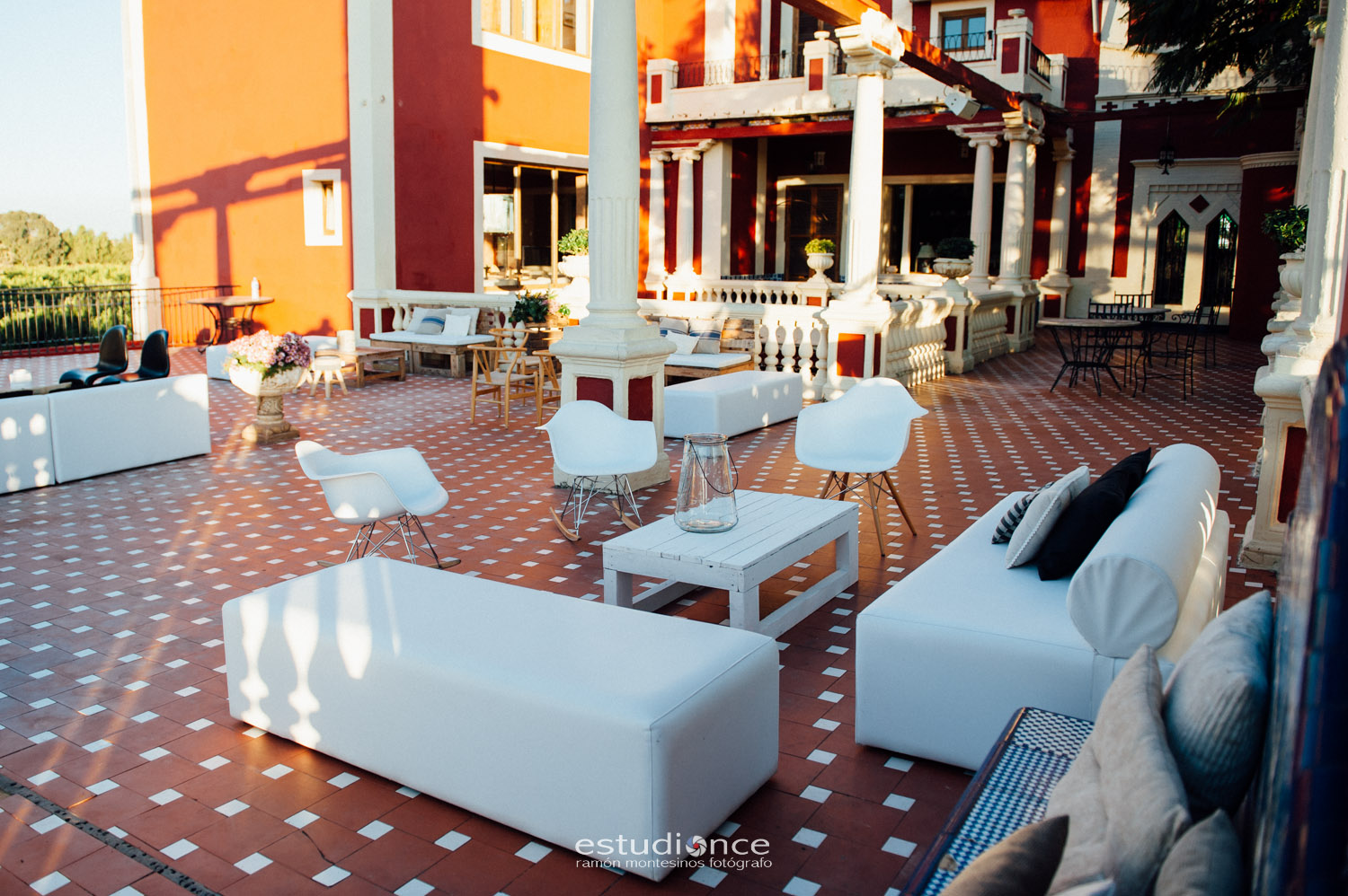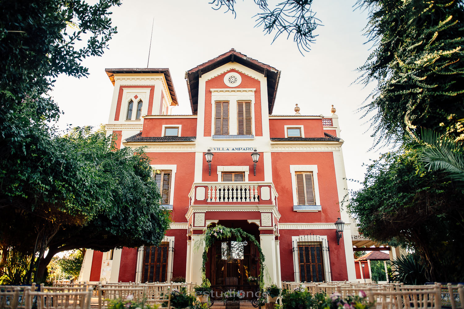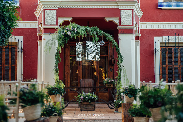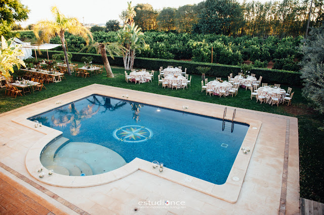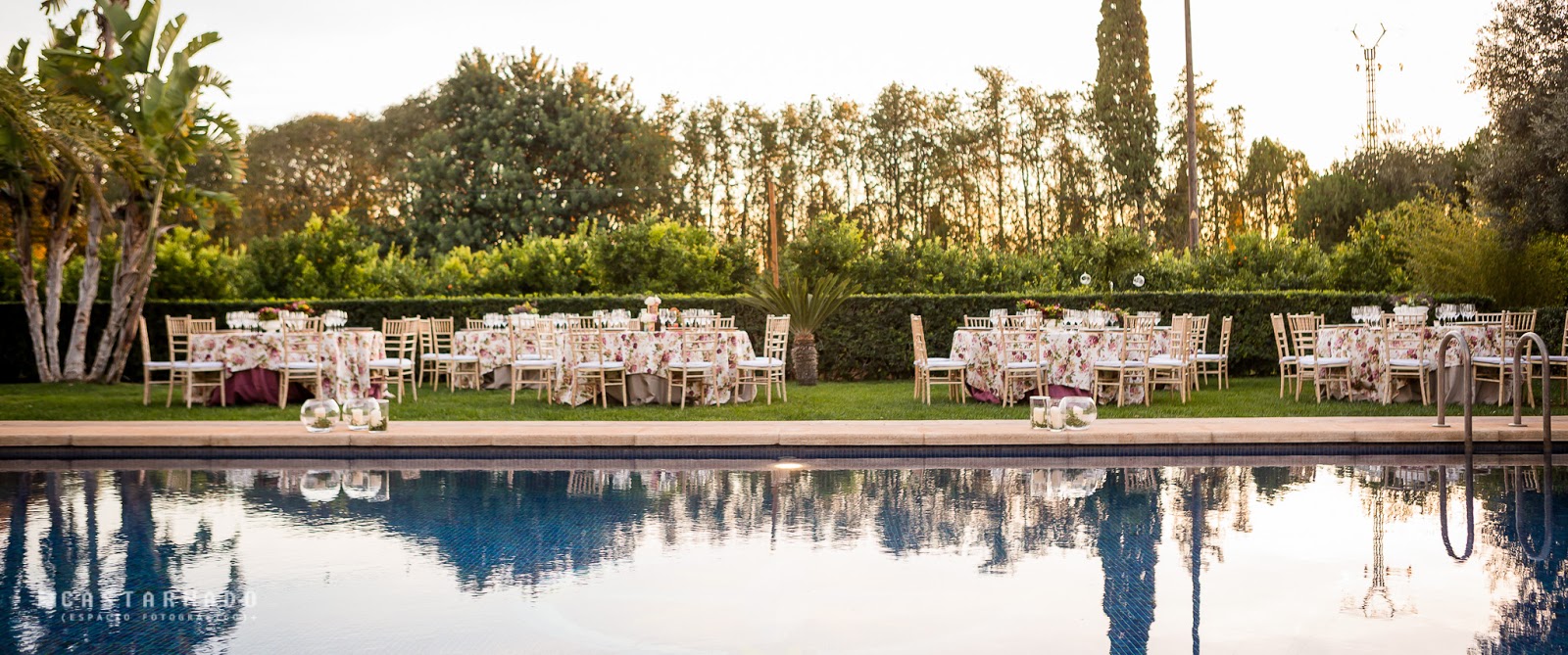 Se trata de una finca del siglo XVIII en Picanya con un edificio principal de color rojizo, un gran jardín con una piscina y varios patios interiores que me parecen maravillosos para el cóctel o el baile.
