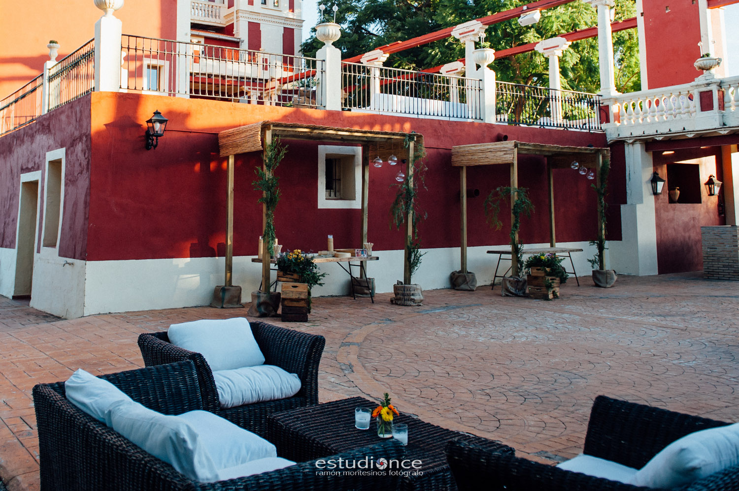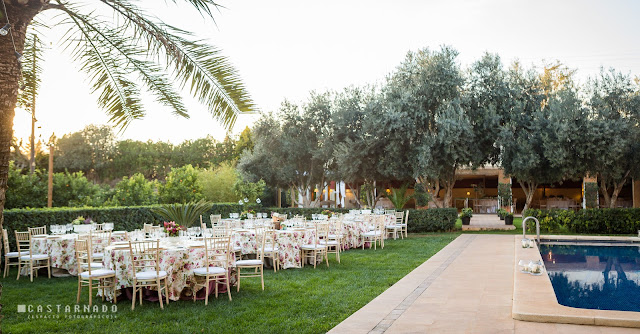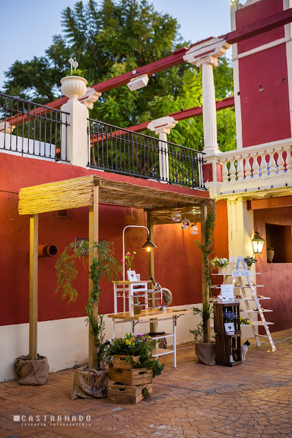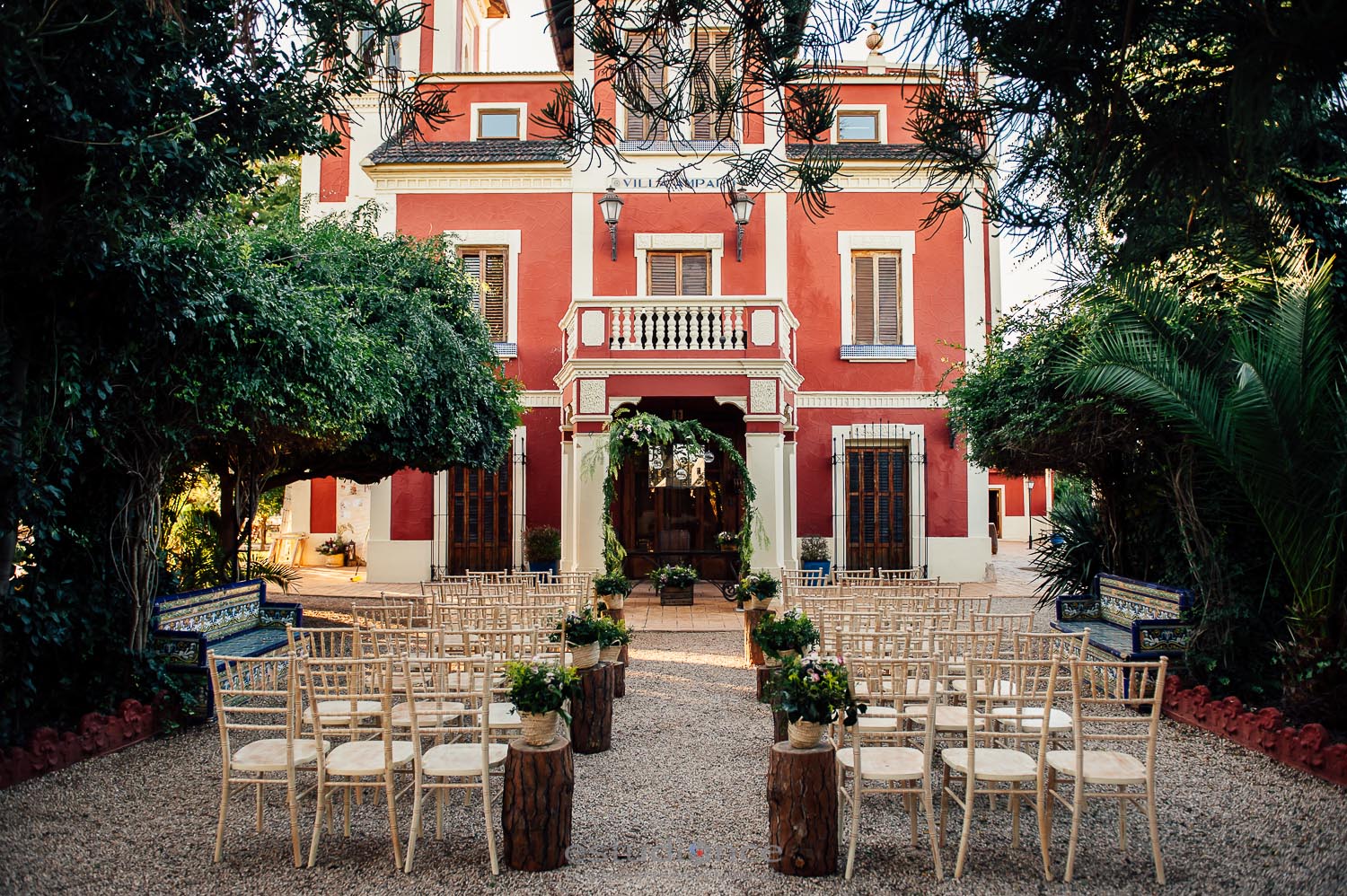 Se trata de una finca del siglo XVIII en Picanya con un edificio principal de color rojizo, un gran jardín con una piscina y varios patios interiores que me parecen maravillosos para el cóctel o el baile.