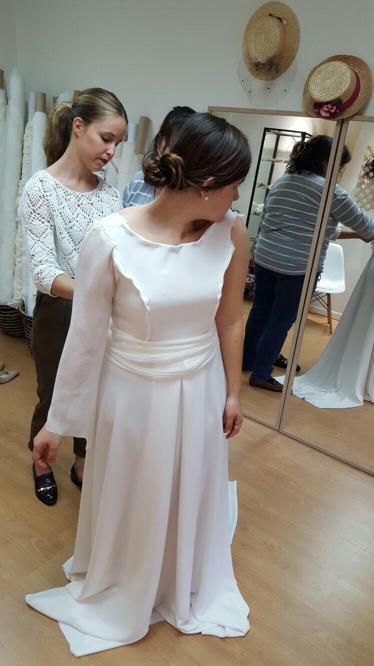 Durante las siguientes pruebas, el vestido irá avanzando poco a poco. En la segunda prueba, ya podrá vestir con las telas definitivas aunque el vestido siga lleno de alfileres y pliegues, será más fácil ir haciéndote una imagen mental del resultado final. Para que os hagáis una idea, mi segunda prueba fue a principios del mes de mayo.
