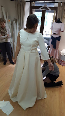 La primera prueba siempre suele ser algo «decepcionante», pero no os asustéis; esto les pasa a todas. Llegamos con mil ganas y se debe empezar con lo que llaman la «toile», una tela que no es la definitiva y que a las modistas les sirve como patrón. Así, la primera prueba es más para ellas que para nosotras, que no siempre conseguimos hacernos una idea de como quedará.
