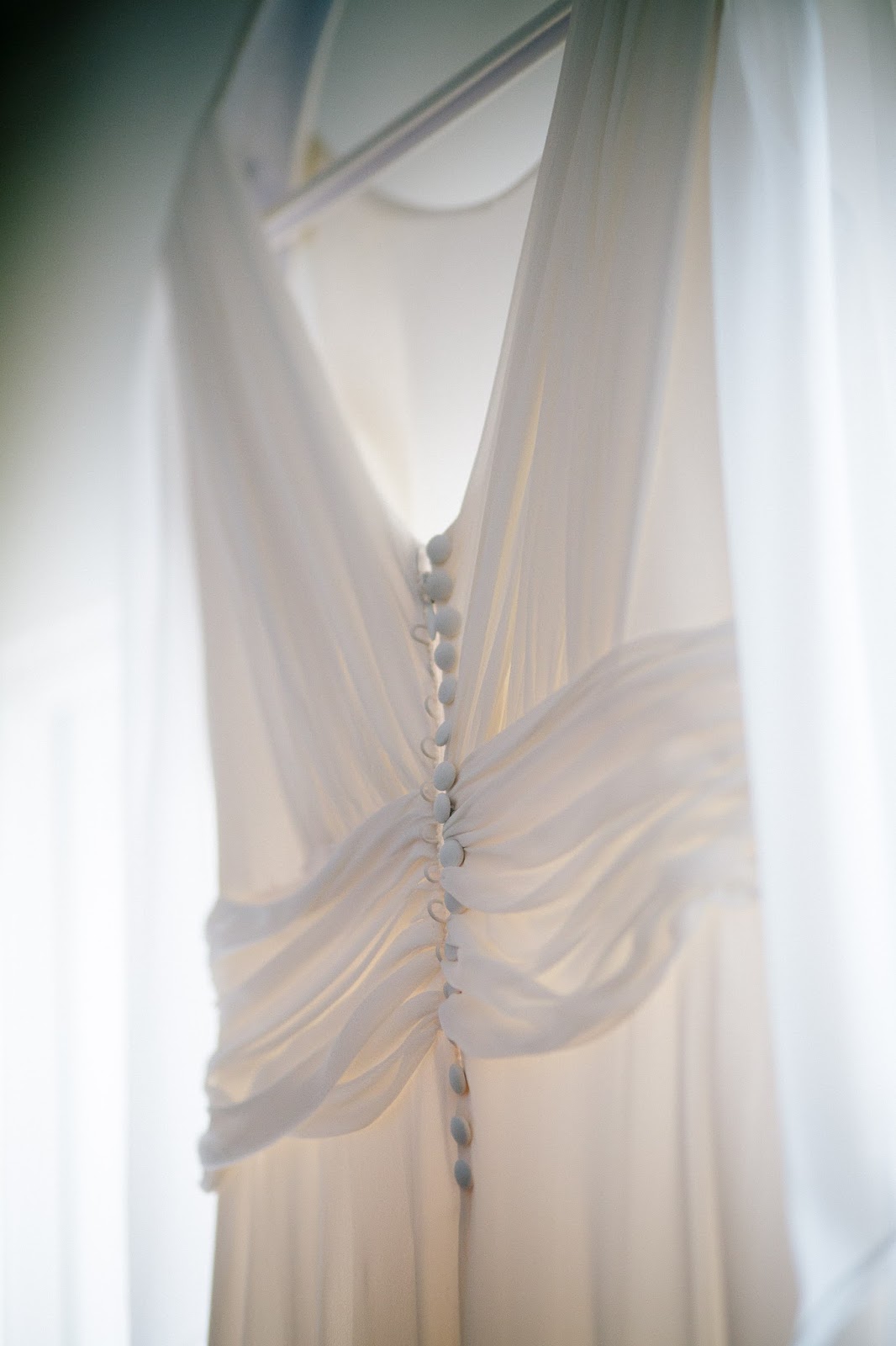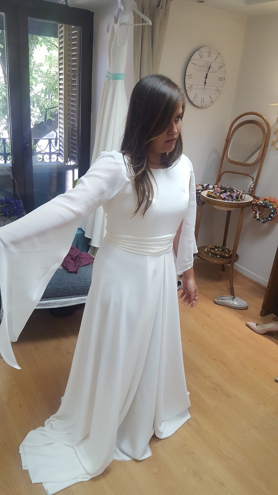 Todo comienza con una lluvia de ideas; cuando decides hacerte un vestido a medida tienes que intentar transmitirle al diseñador todo lo que te habías imaginado. En mi caso, no os creáis que era mucho. Sí tenía claro que quería un vestido de líneas puras, sin encajes ni pedrerías. La espalda tenía que ser abierta y debía llevar mangas. Los detalles que más me gustan: el plumetti, los botones en la parte trasera y los plisados. También buscaba telas ligeras, con mucha caída; os confieso que ya me había informado y lo que parecía encajar con mis ideas era el crêpe de seda, el georgette…