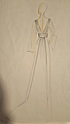 Así que, con todas estas aportaciones, Lucía de Miguel creó 3 bocetos para mí…y con un poquito de unos y otro poco de otros salió mi vestido. Introdujimos un nuevo detalle que no contemplaba: las mangas acampanadas. La idea nos la dió ella y nos encantó, era la última chispa que le faltaba al vestido. Como os he dicho, yo llevaba la idea del plumetti pero en un principio no lo pusimos en el boceto.