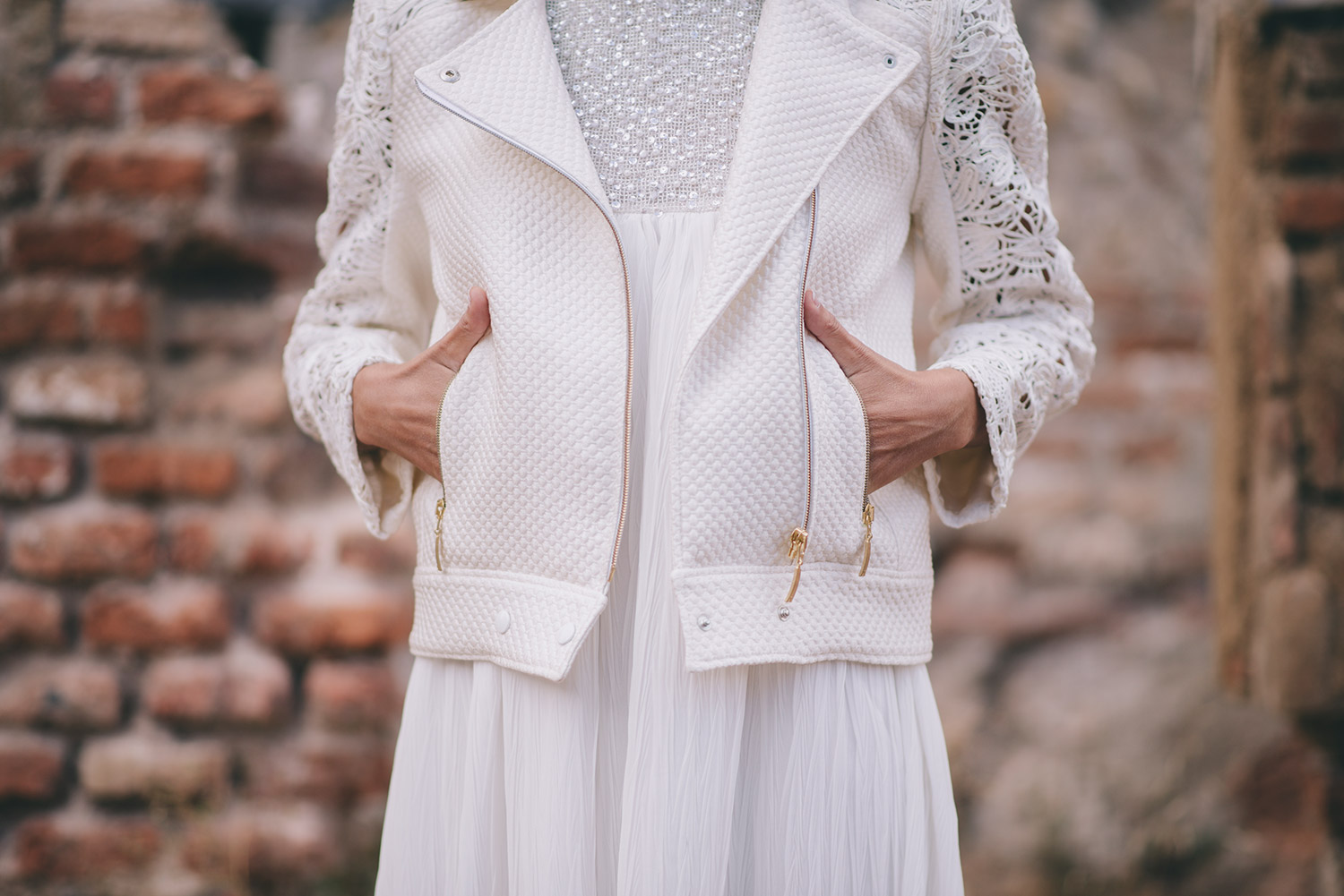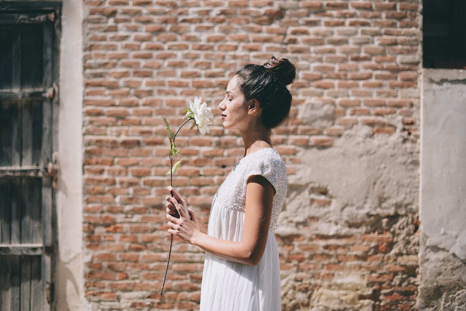 En esta colección nos encontramos con telas ligeras y prendas muy fluidas: gasa de seda, crepé, brocados y algo de tul de seda. Además, incluye detalles bordados, algo de encaje, y volantes. Para darle algo más de chispa, la firma incluye puntadas de color que hacen los vestidos más especiales. Uno de ellos es en dos piezas, siguiendo la tendencia del momento. Fijaros en la chaqueta con puntilla que le da un toque rockero al look nupcial. Dentro de la visión más transgresora, la firma también plantea un vestido de novia corto.