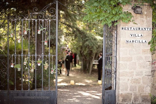 Fue una boda de mediodía que continuó en el restaurante Villa Marcilla. Una vez allí, la temática del aperitivo fue la caza, creando unos rincones llenos de verde, que iban muy acordes al entorno rural de la villa. La comida fue al aire libre y la temática de las mesas se basó en el golf, ya que los novios son unos aficionados al deporte.