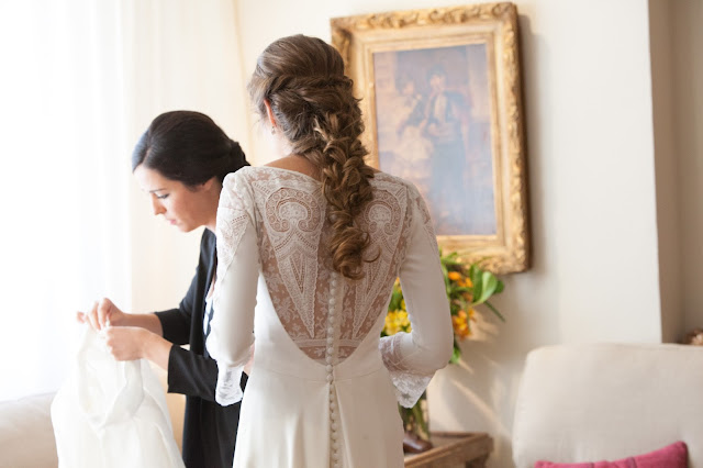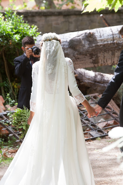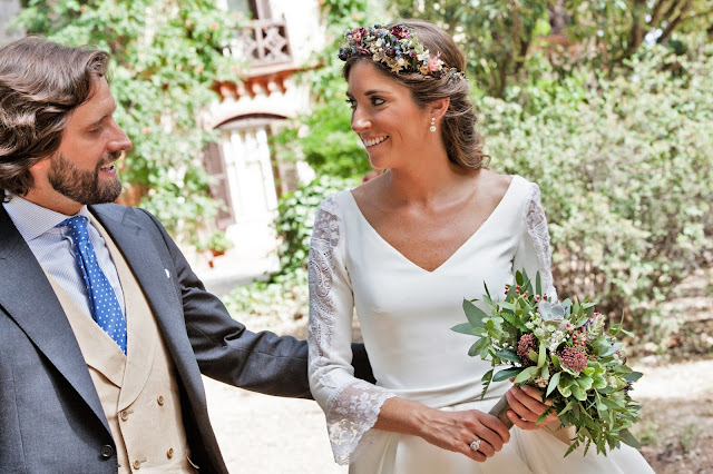 Para su gran día, Beatriz escogió a la firma Navascués que le confeccionó un precioso vestido con espalda y mangas de encaje. Su algo prestado fue una mantilla familiar, combinada con una preciosa corona de Suma Cruz. Además, llevo unos zapatos de la firma Franjul.