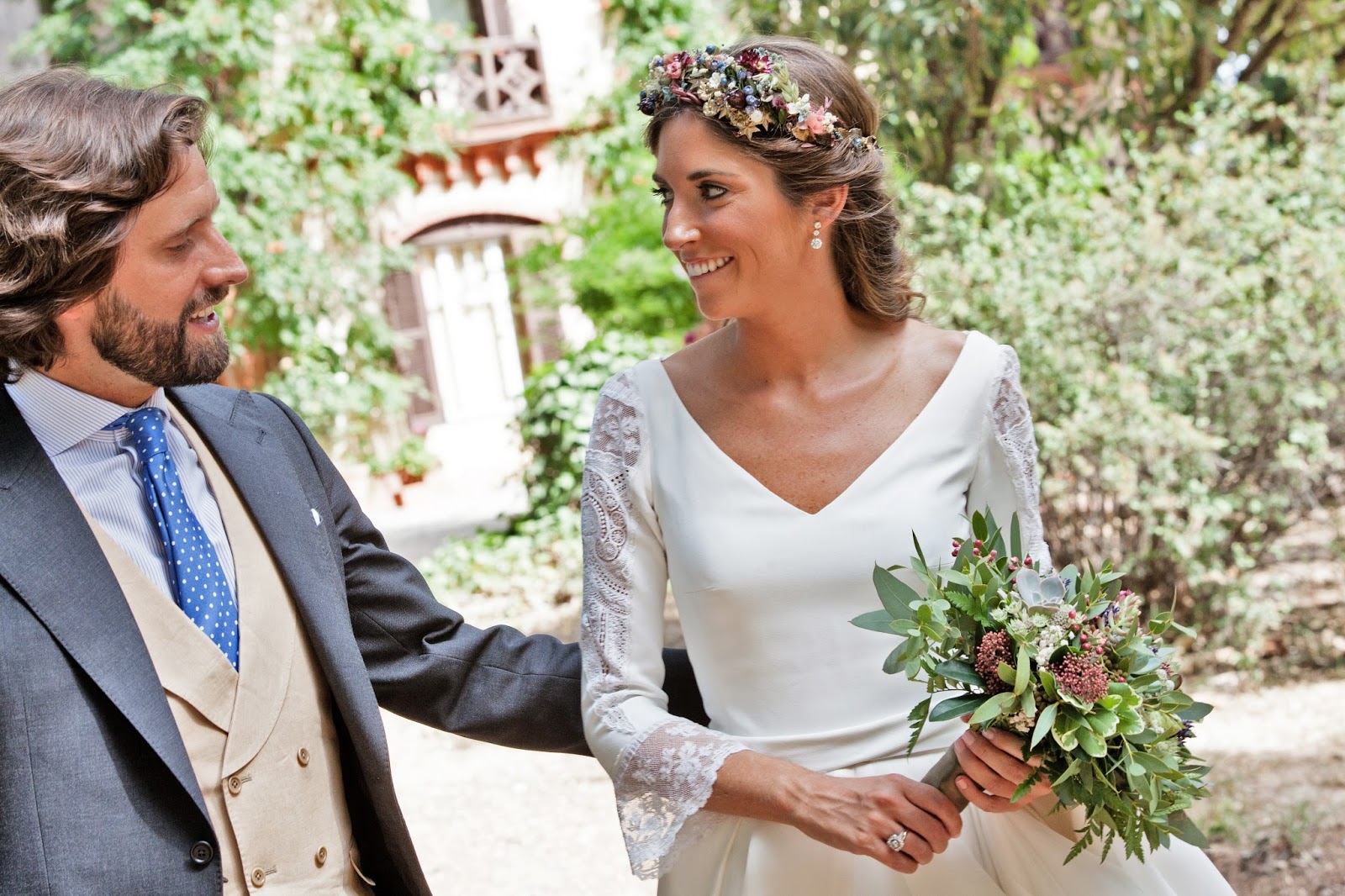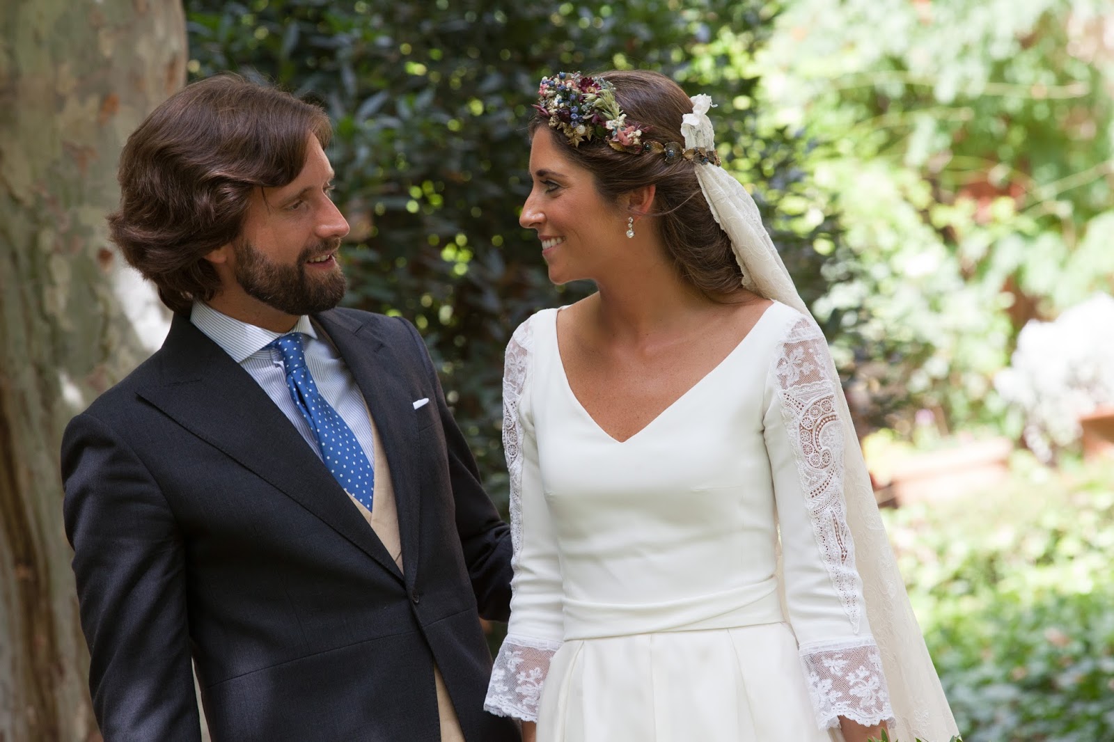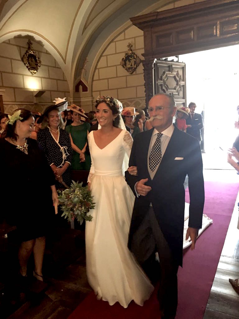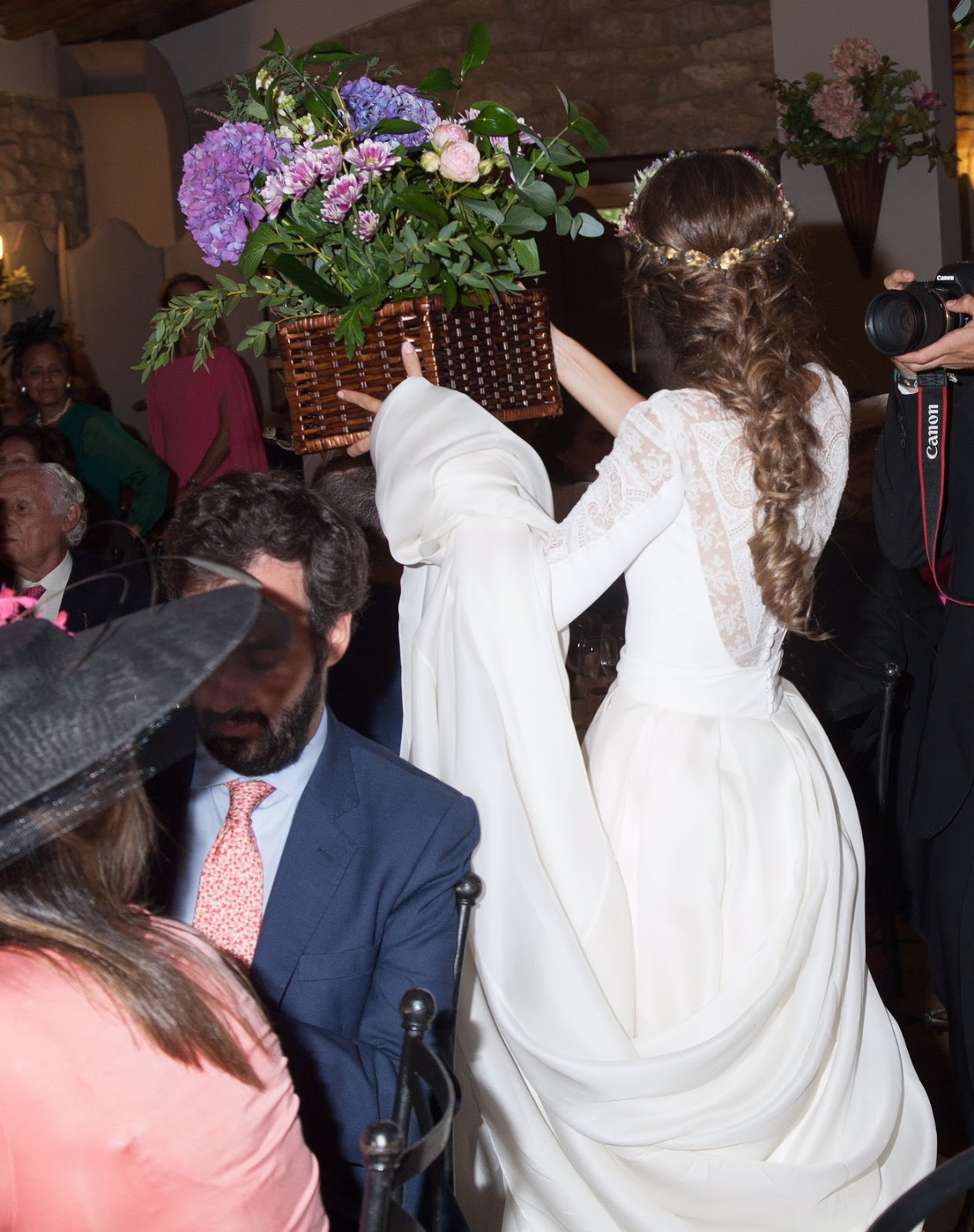 Para su gran día, Beatriz escogió a la firma Navascués que le confeccionó un precioso vestido con espalda y mangas de encaje. Su algo prestado fue una mantilla familiar, combinada con una preciosa corona de Suma Cruz. Además, llevo unos zapatos de la firma Franjul.