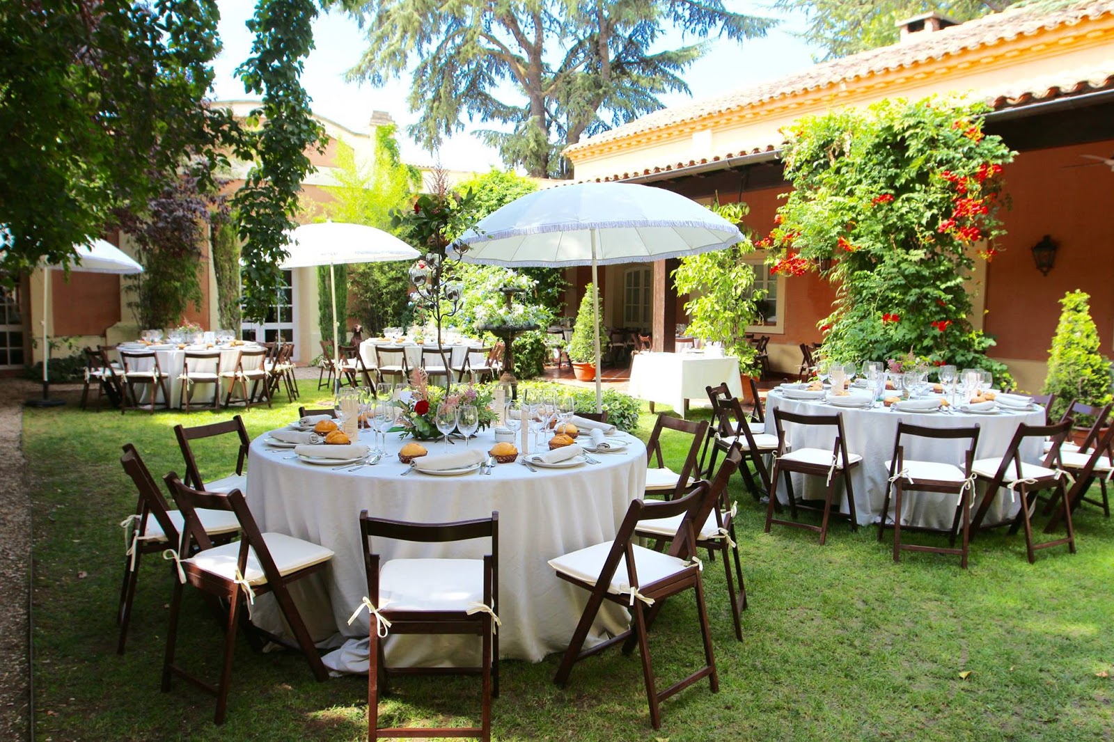 Fue una boda de mediodía que continuó en el restaurante Villa Marcilla. Una vez allí, la temática del aperitivo fue la caza, creando unos rincones llenos de verde, que iban muy acordes al entorno rural de la villa. La comida fue al aire libre y la temática de las mesas se basó en el golf, ya que los novios son unos aficionados al deporte.