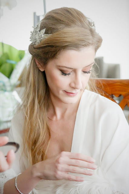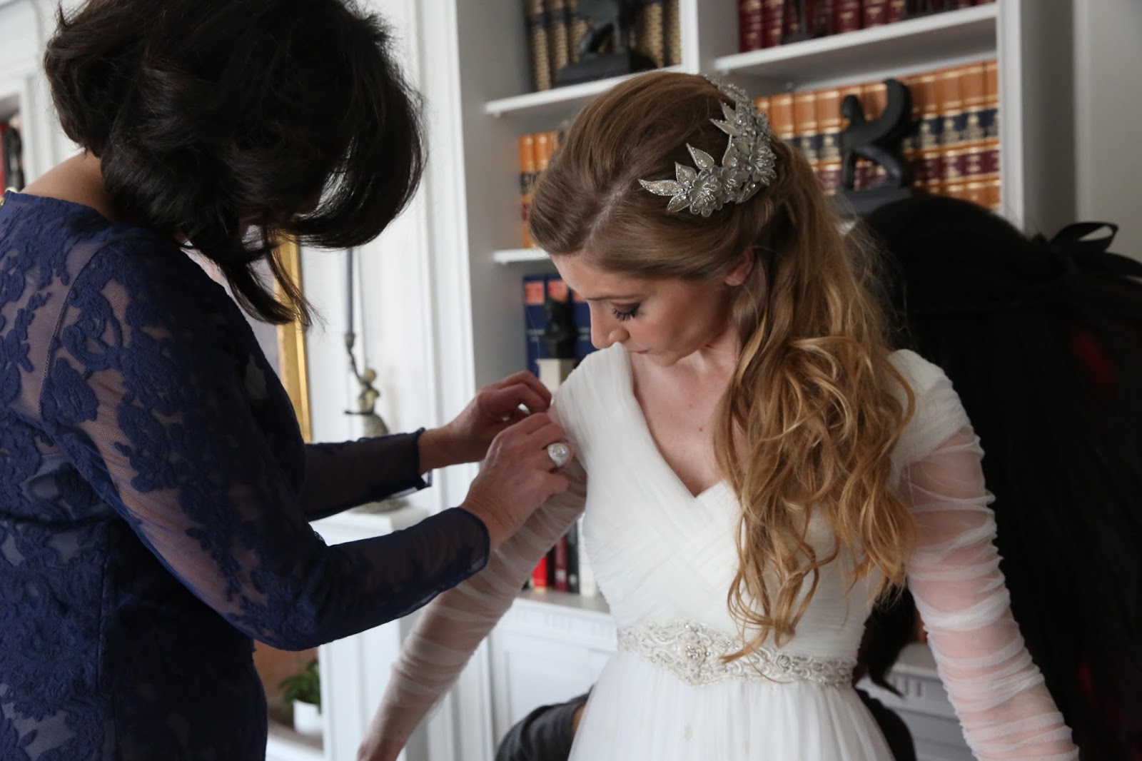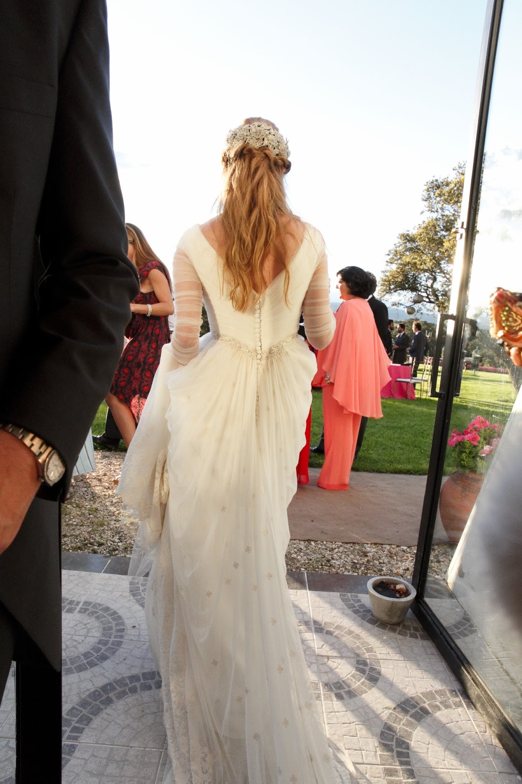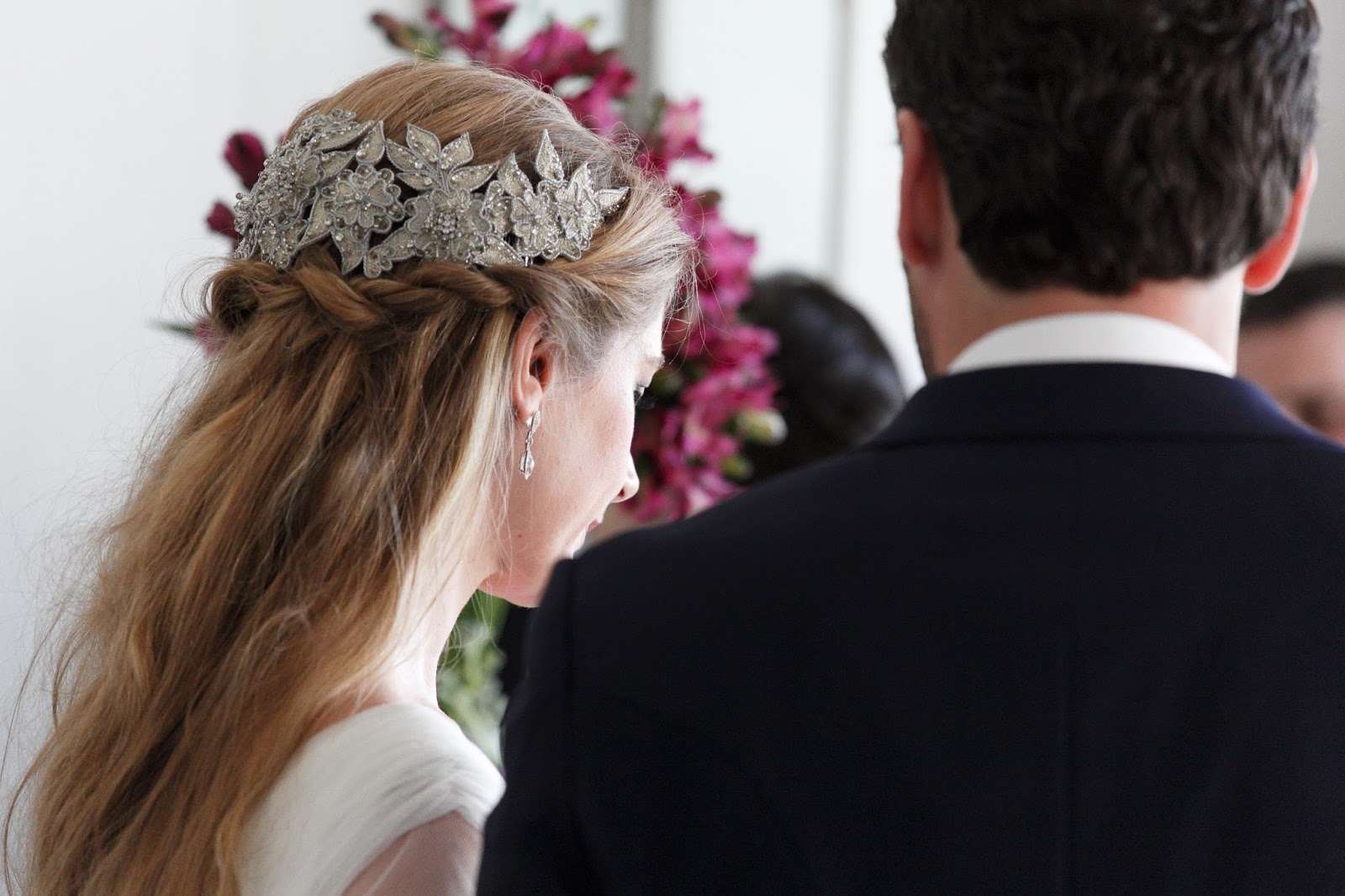 Para su gran día María confió en la diseñadora Beatriz Álvaro, el resultado fue un romántico vestido con manga de gasa y un broche central. Su impresionante tocado era de la firma Carmen María Mayz y se atrevió con unas preciosas cuñas de Steve Madden, muy cómodas. Sonia Marina se encargó del maquillaje y del ideal semirrecogido trenzado que llevaba María. Su ramo, en tonos blancos y verdes, lo firma María Redón de Sibilina Deco.