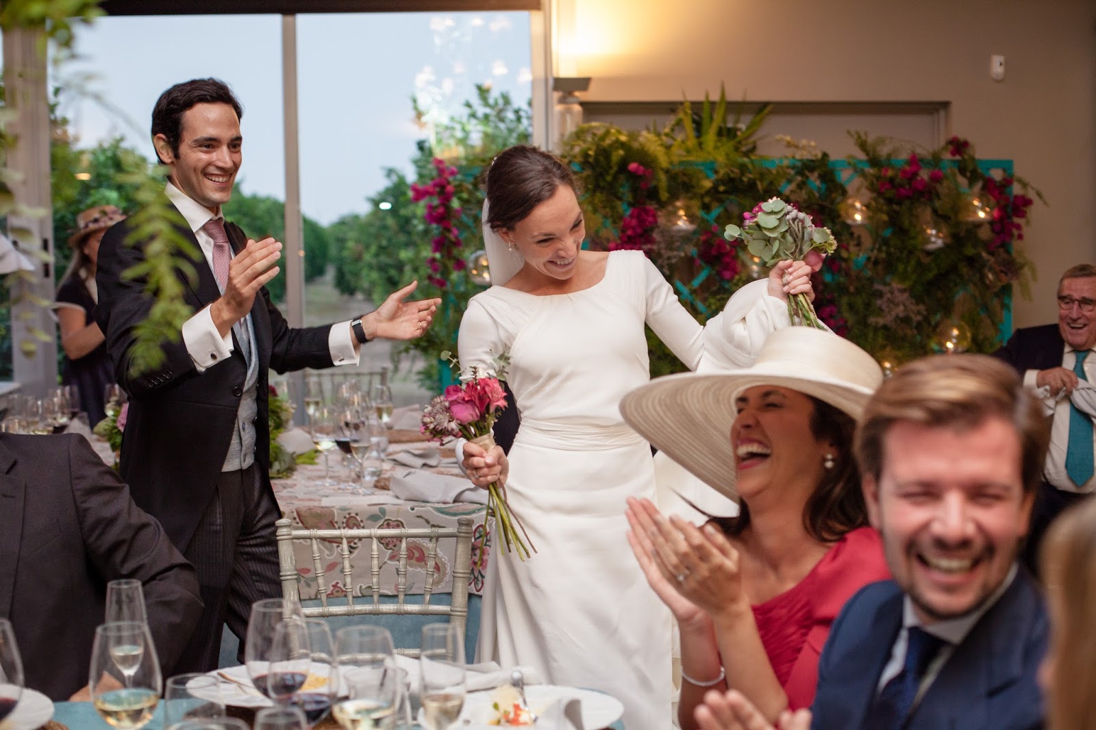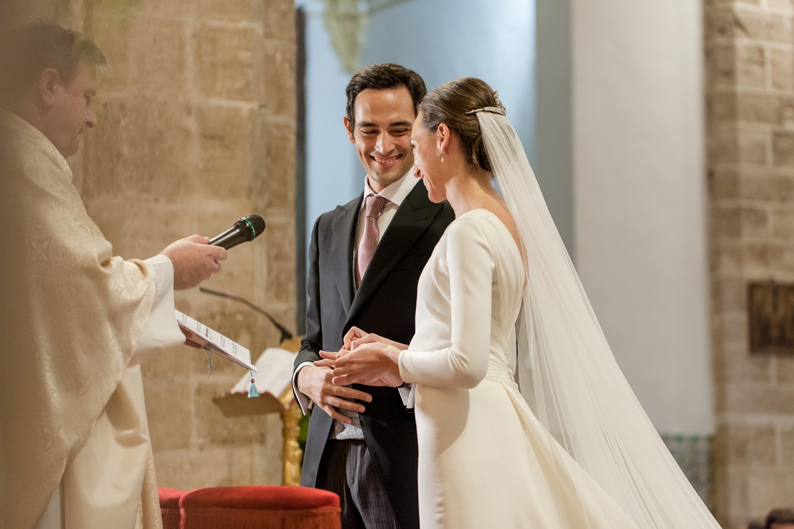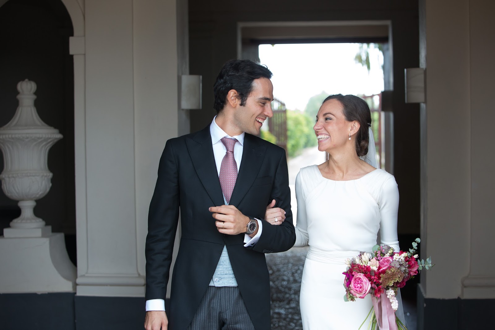 María acudió a su amiga Cristina de Navascués, quien enseguida captó la idea que buscaba. Y confeccionó para ella un atemporal vestido con escote en la espalda y manga larga, muy it. Su tocado fue su algo prestado, resultado de una pulsera de la abuela de Juan y un broche de la abuela de María. Su ramo en tonos fresa era de Flores La Tartana.