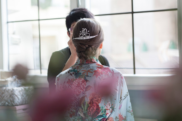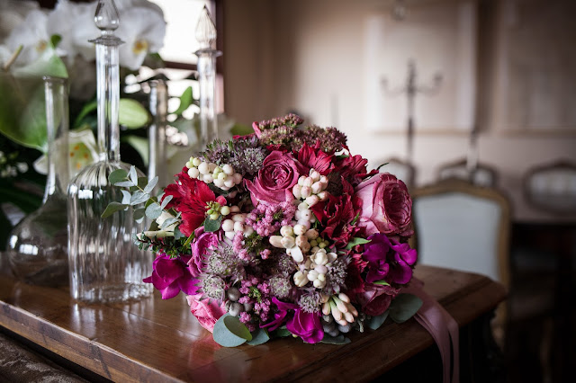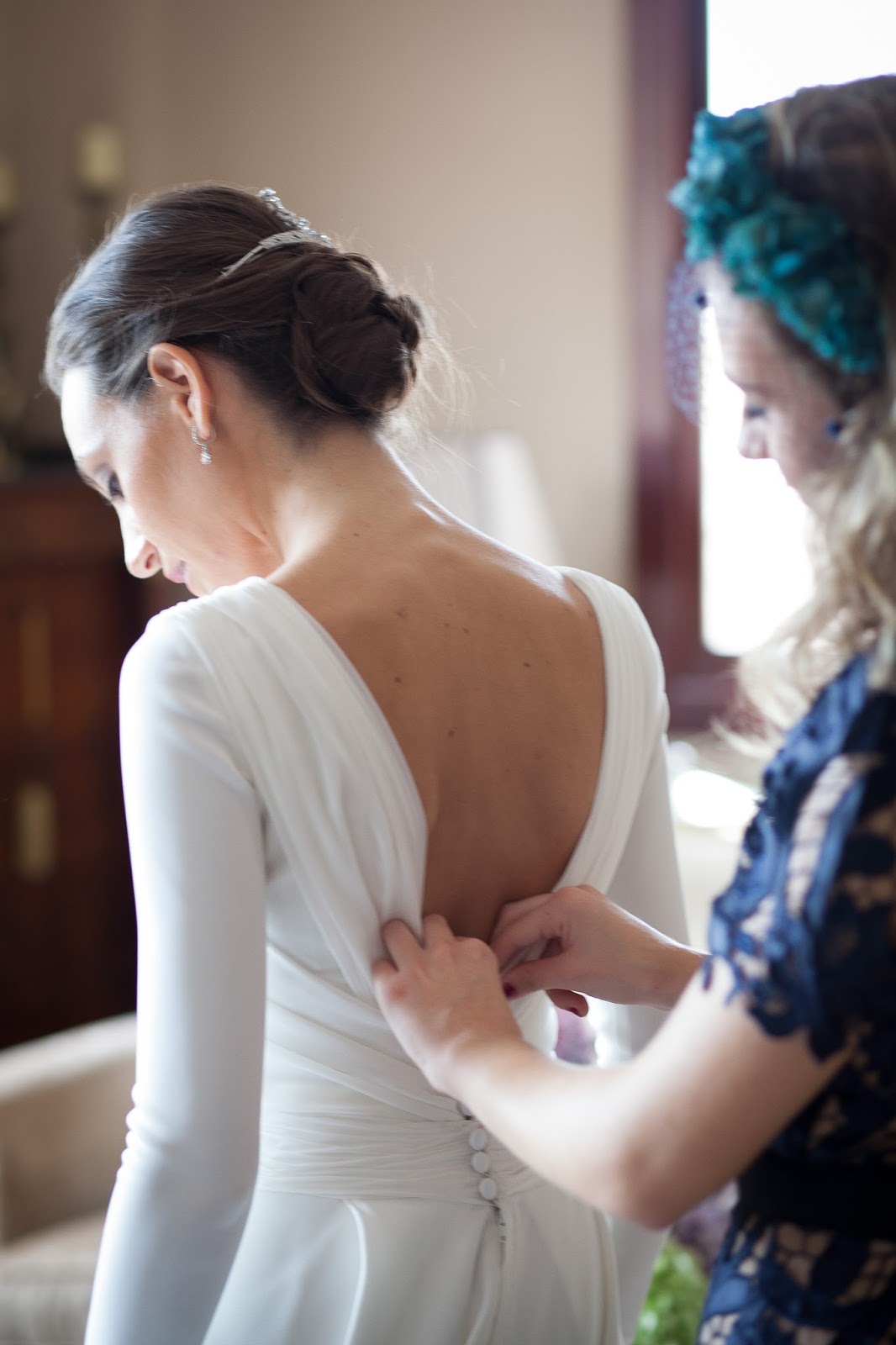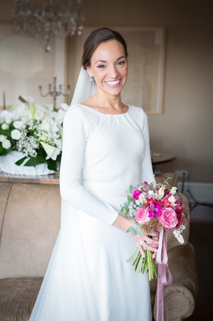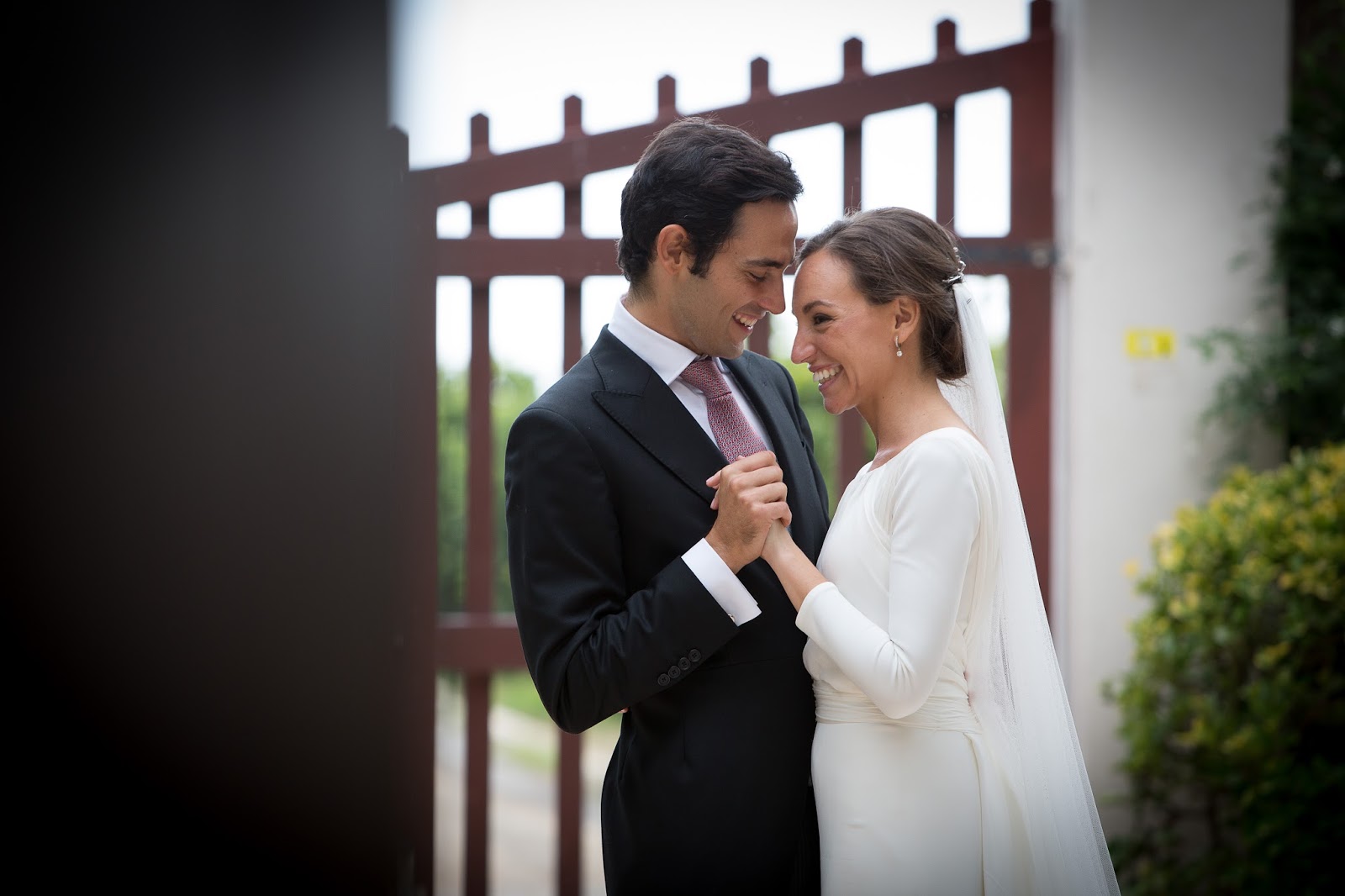 María acudió a su amiga Cristina de Navascués, quien enseguida captó la idea que buscaba. Y confeccionó para ella un atemporal vestido con escote en la espalda y manga larga, muy it. Su tocado fue su algo prestado, resultado de una pulsera de la abuela de Juan y un broche de la abuela de María. Su ramo en tonos fresa era de Flores La Tartana.