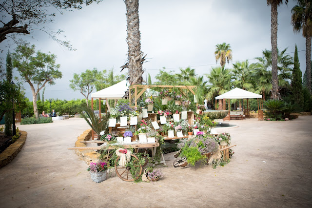 En la Alquería de Mascarós, Flores La Tartana montó un seatingplan con base de macetas sobre carros, una tabla y un arco de madera decorado con vegetación en las mismas tonalidades que la iglesia. Para el salón, colocaron mucho verde sobre las preciosas lámparas y árboles entre las mesas, lo que ampliaba la decoración al plano vertical. Como centros de mesas, hileras de macetas muy distintas, todas llenas de flor, combinadas a la perfección. MUY TOP! Para el catering contaron con Grupo Peñalén.