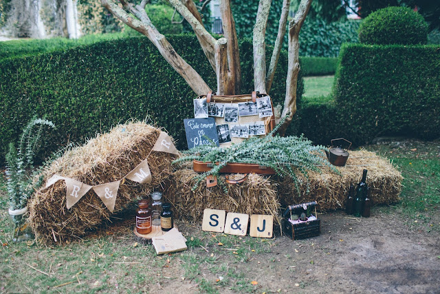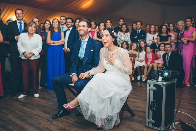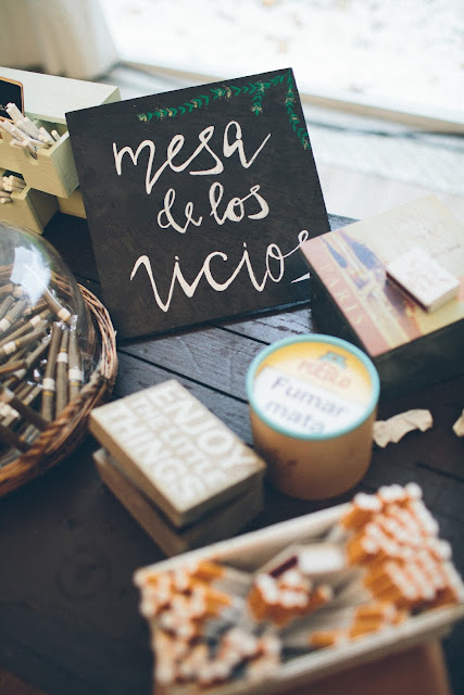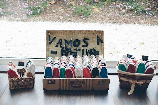 Los propios novios se encargaron de lo que llaman «La mesa de los vicios», me encanta. Además, prepararon un rincón con alpargatas y una maleta antigua de la abuela de la novia, que resultó muy útil para las invitadas que se cansaban de sus tacones. Estos novios tuvieron detalles para todo el mundo, las parejas que esperaban un bebé recibieron unos preciosos bodies de Pimpis&lampis, una monada!