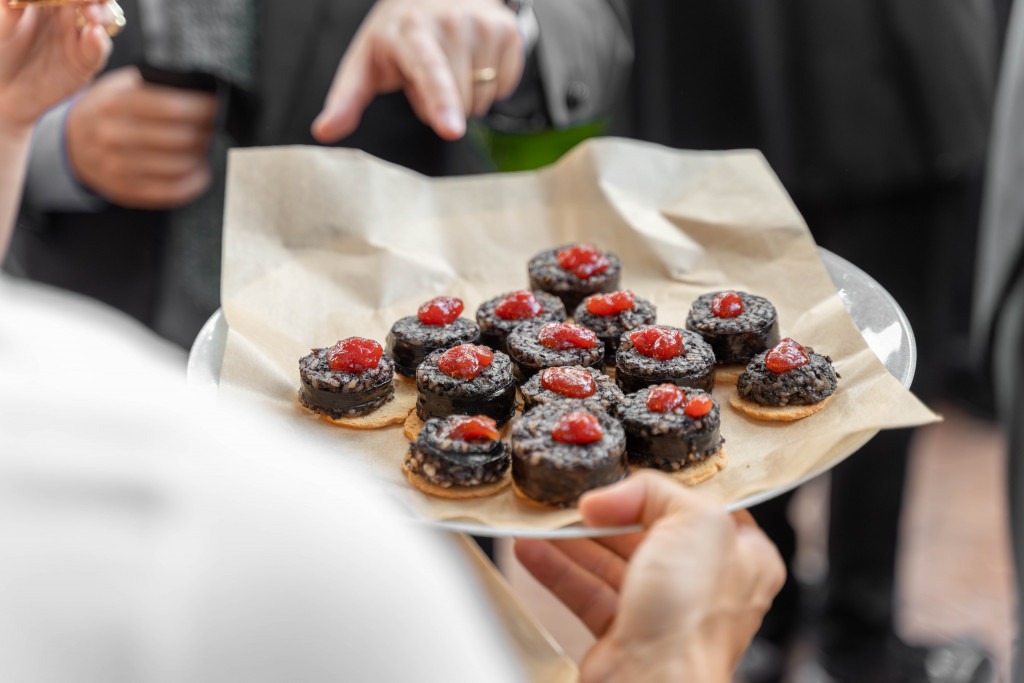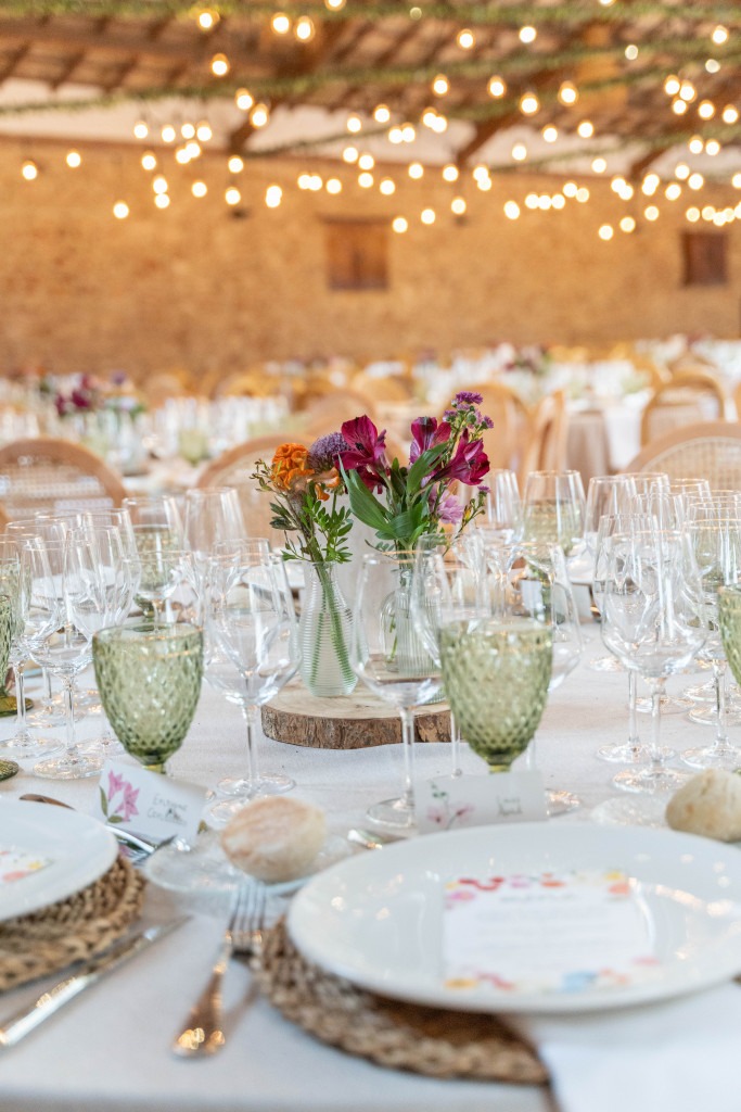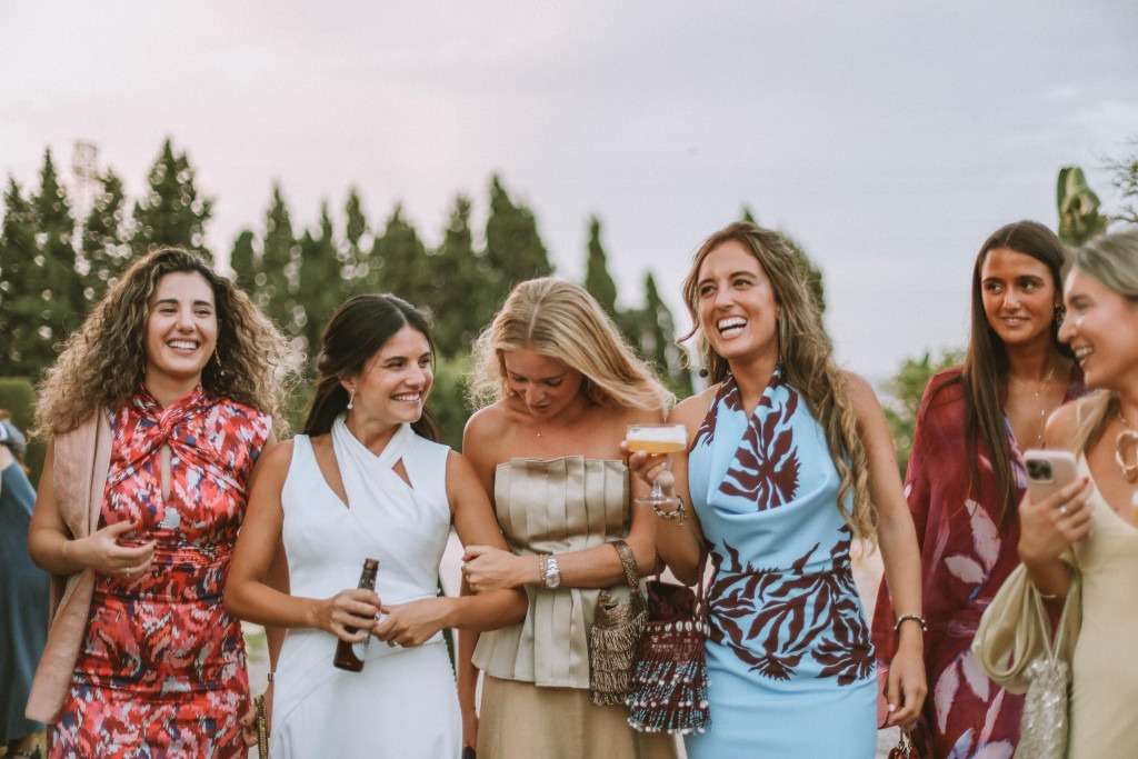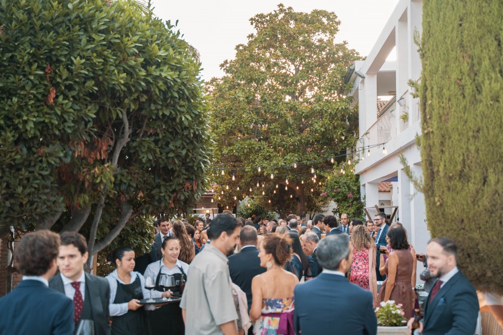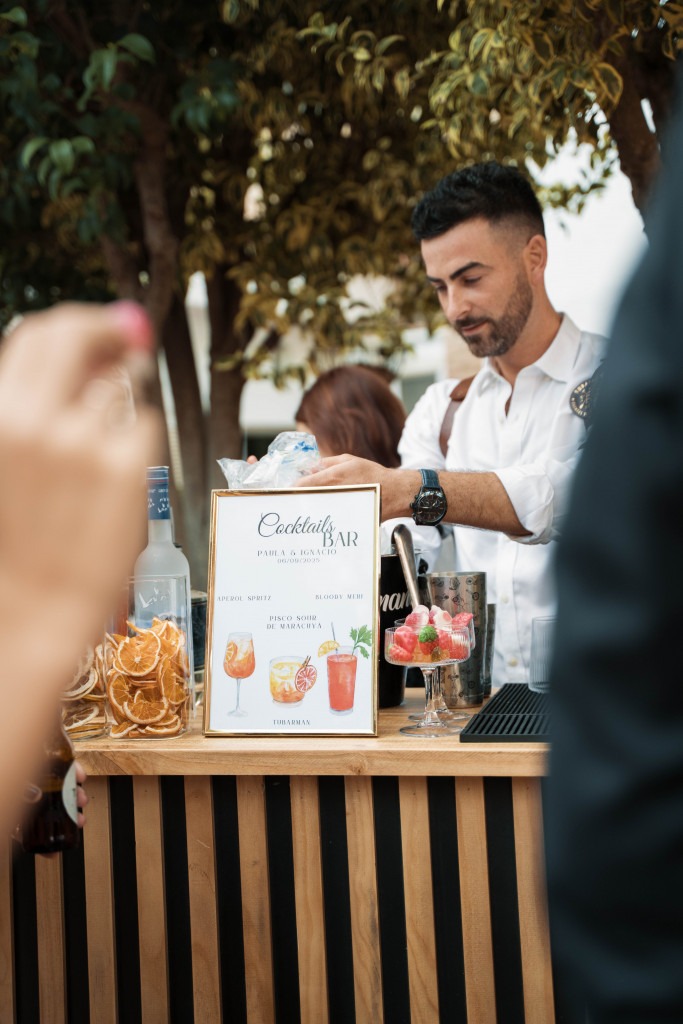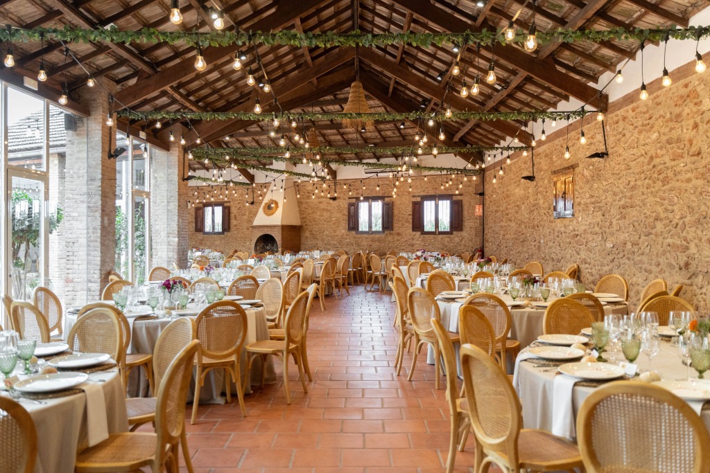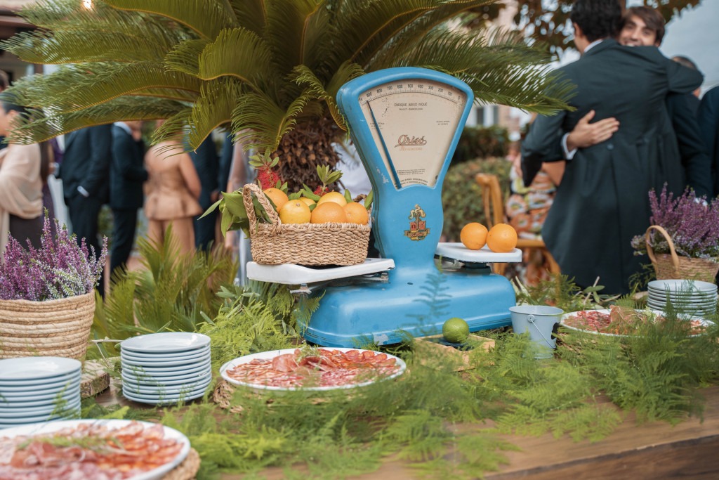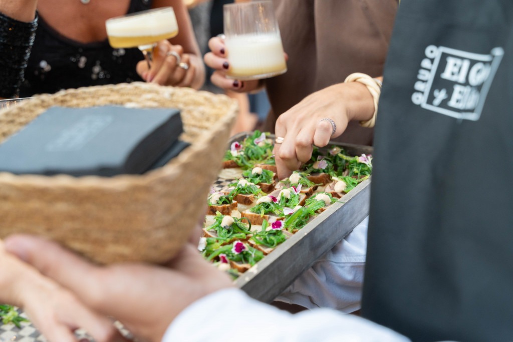 «Después de este momento, todo comenzó. Pasaron al patio principal donde pudieron disfrutar de la gastronomía a la vez que recorrían el espacio entre risas y abrazos de sus invitados rodeados de naturaleza ofreciéndoles un escenario perfecto para su cóctel íntimo y cuidado al detalle, tal y como siempre habían soñado. Abrieron la cena con su gran entrada donde estuvieron arropados por el cariño de todos los suyos levantando los brazos a la vez. Una vez sentados en su rústico salón, propio de esta masía y acorde a lo que le envuelve, se sumergieron en una experiencia gastronómica única, firmada por el grupo El Gordo y El Flaco.